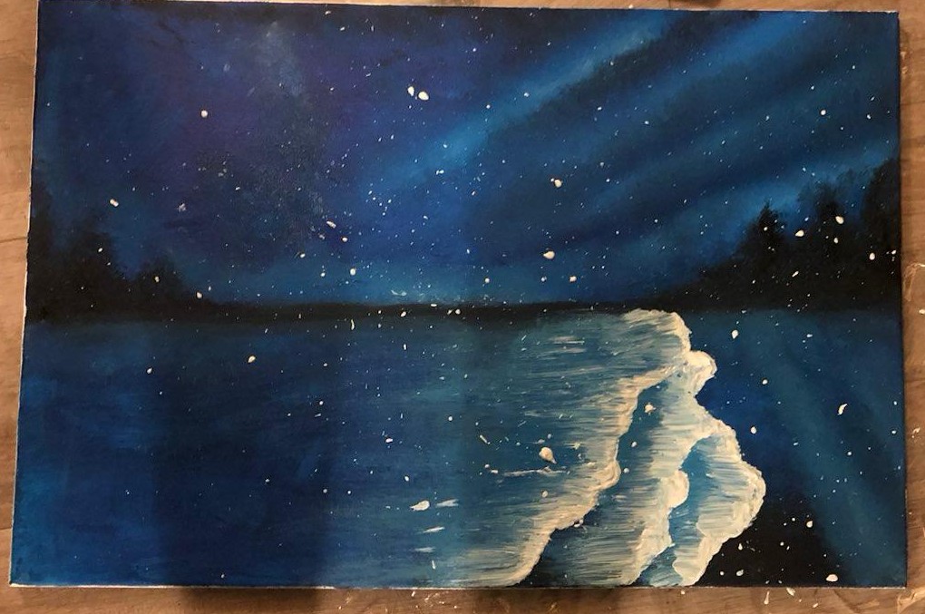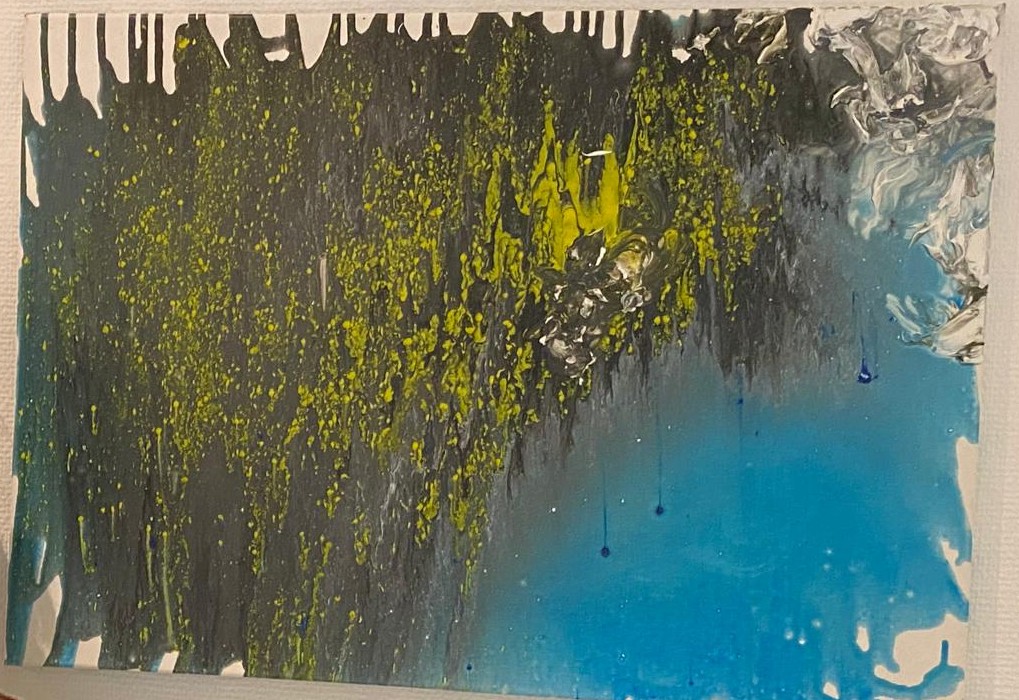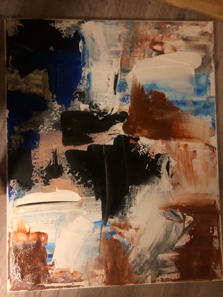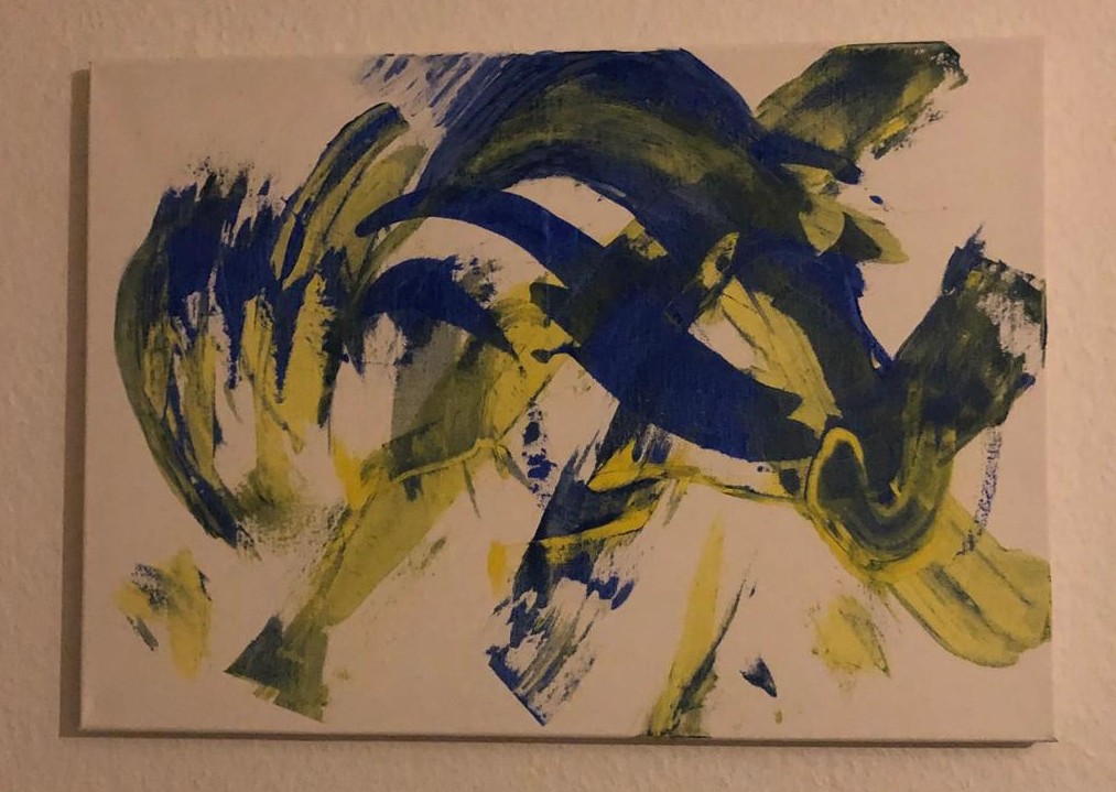 Dieses Werk spielt mit der Spannung zwischen Bewegung und Ruhe, zwischen Tiefe und Leuchten. Das intensive Blau trifft auf ein warmes, sonniges Gelb – zwei Farben, die sich kontrastreich begegnen und doch miteinander verschmelzen. Die kräftigen Pinselstriche erzählen von Energie, Aufbruch und Emotion, während die leeren Flächen Raum für Stille und Atem lassen.