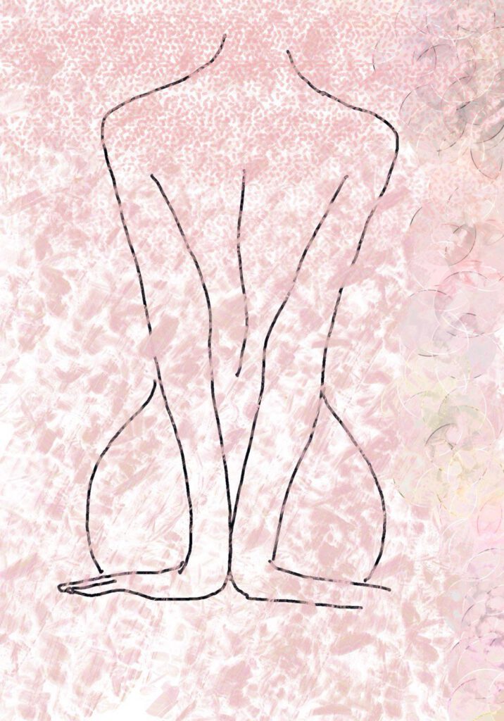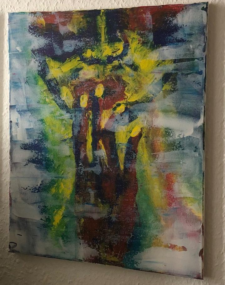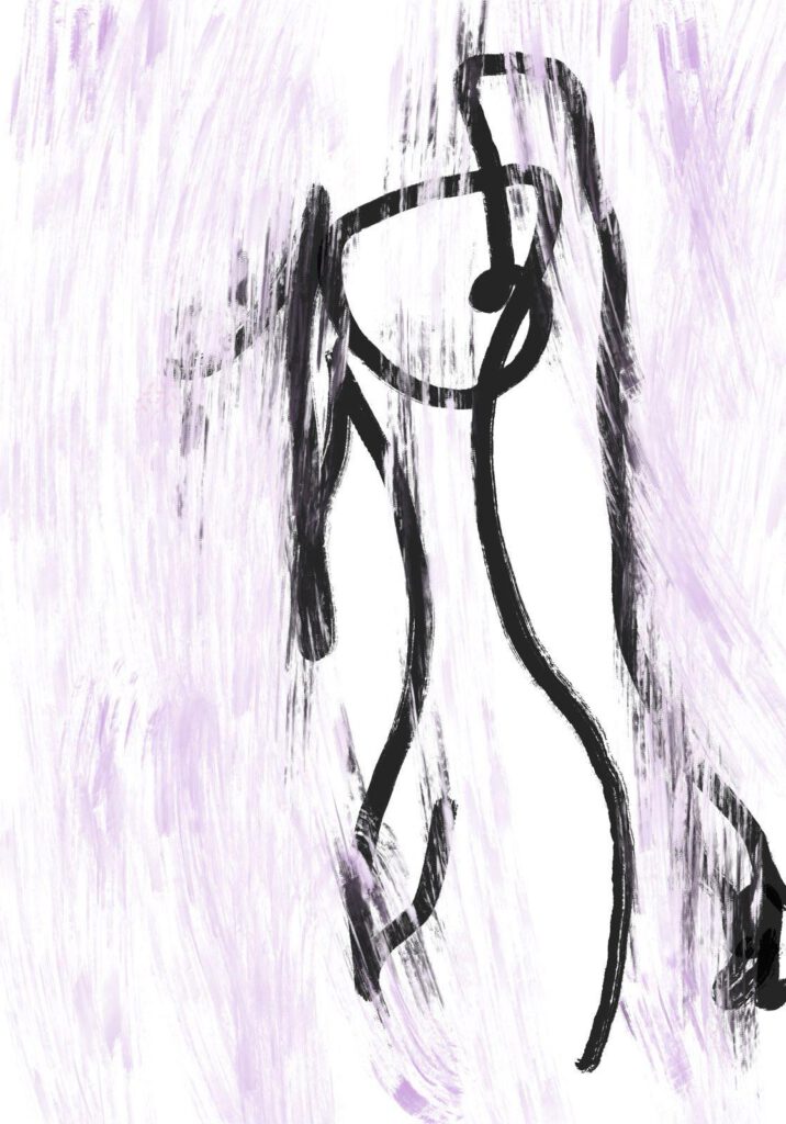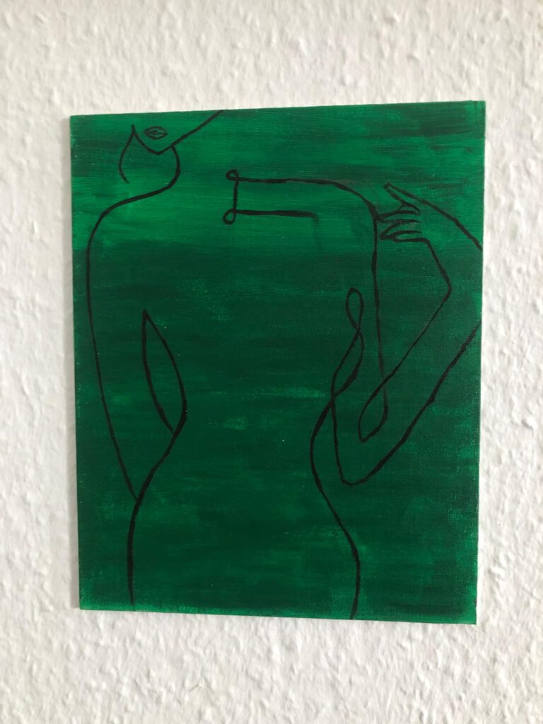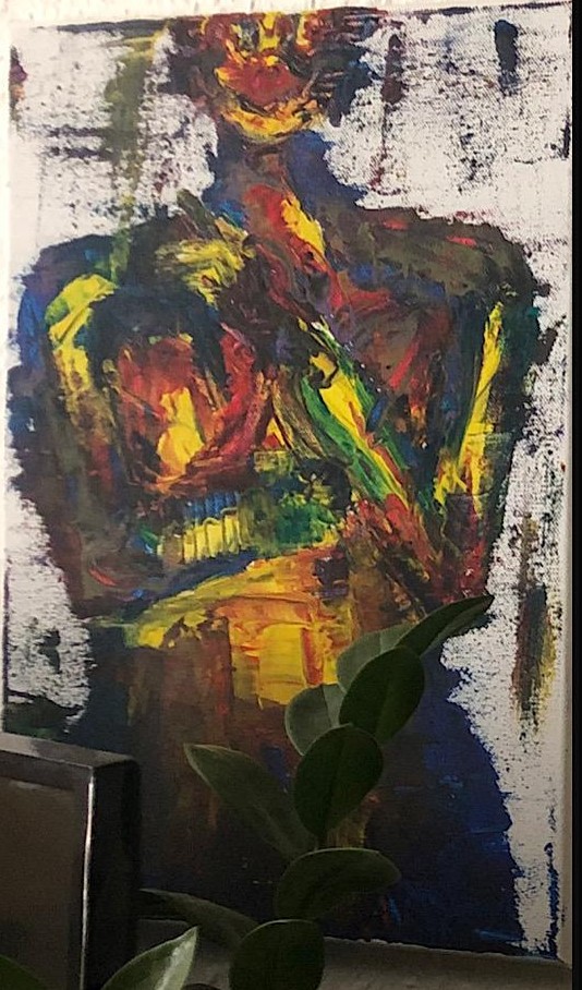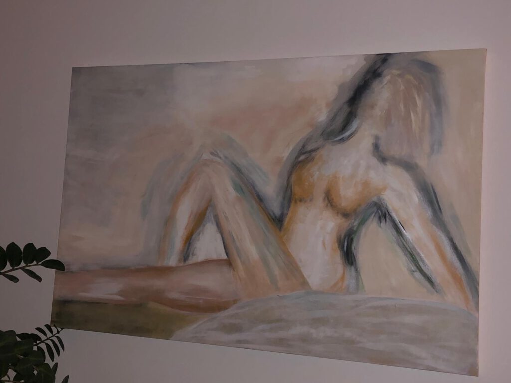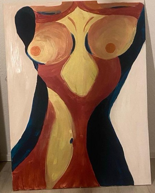 Dieses großformatige Acrylgemälde (60×100 cm) zeigt eine abstrakte Darstellung des menschlichen Körpers. In fließenden Linien und organischen Formen entsteht eine Gestalt, die zugleich körperlich präsent und skulptural wirkt – fast wie eine Statue aus Farbe.