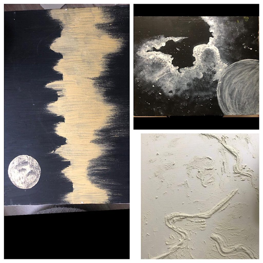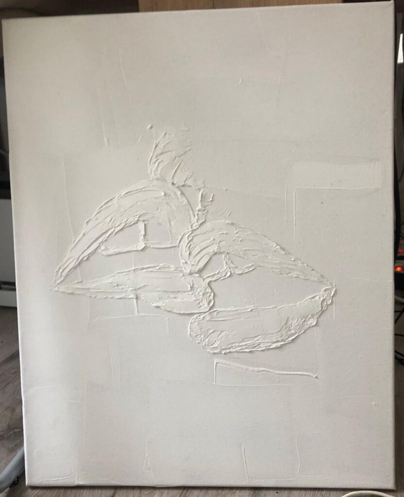 Mit Strukturpaste auf Leinwand gestaltet, entsteht die Szene ausschließlich über Form und Licht: ohne Farbe, ohne Ablenkung.