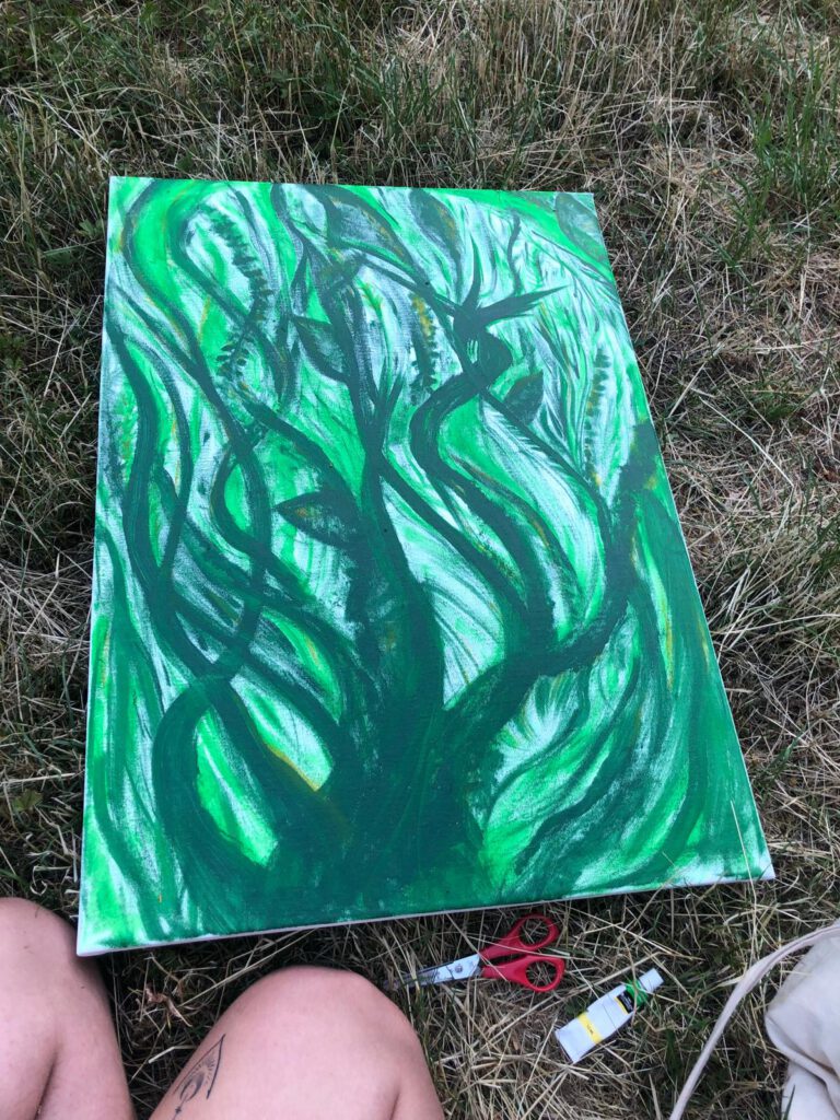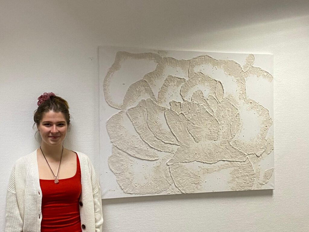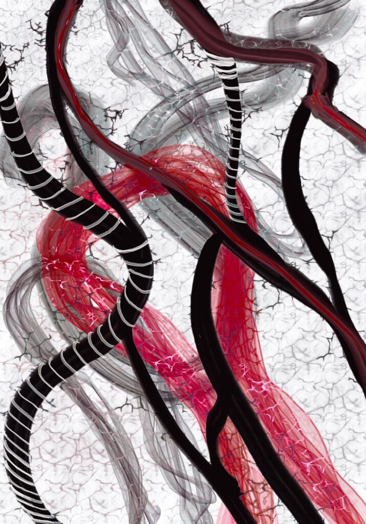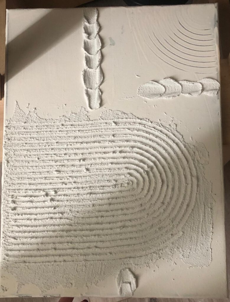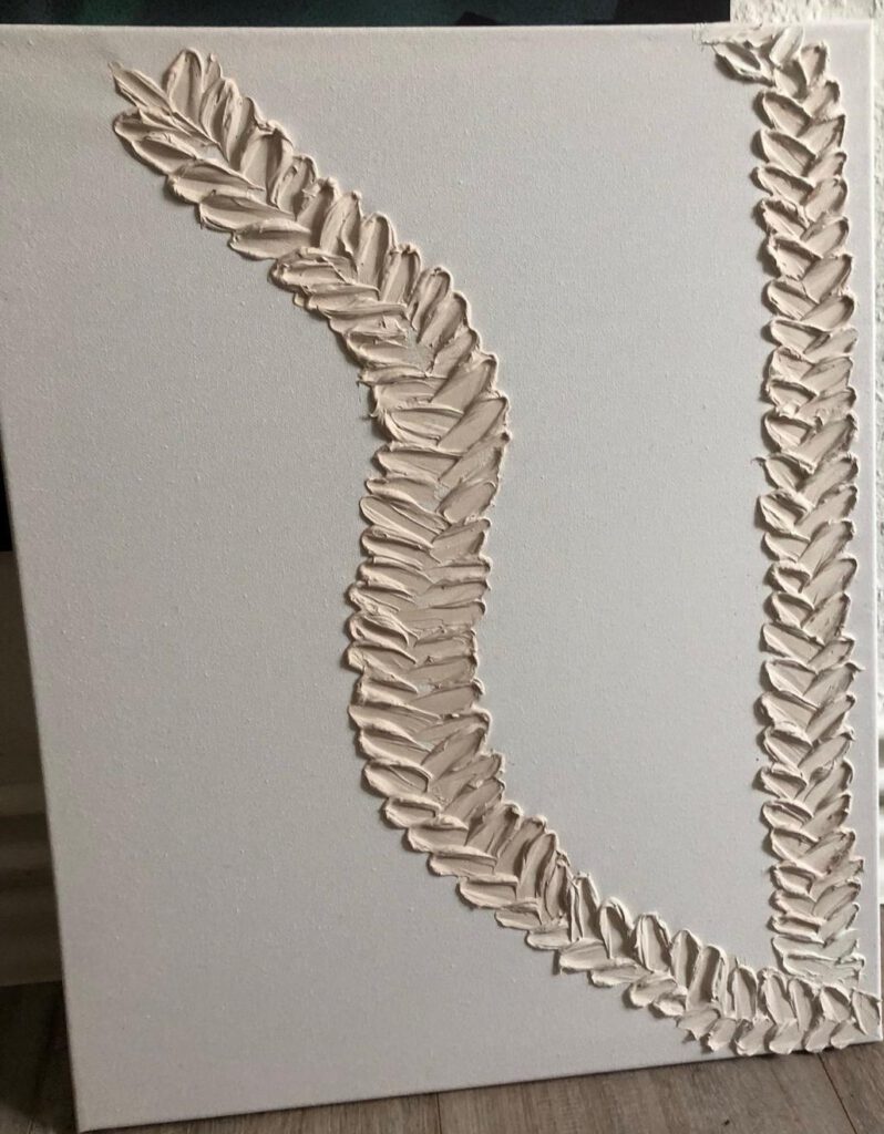Auf einer 40×50 cm großen Leinwand formen plastische Elemente aus Strukturpaste eine organische Linie, die an ein verflochtenes Band aus Blättern erinnert. Das Spiel von Licht und Schatten lässt die reliefartige Oberfläche lebendig wirken und verleiht dem Werk eine sanfte Dynamik.