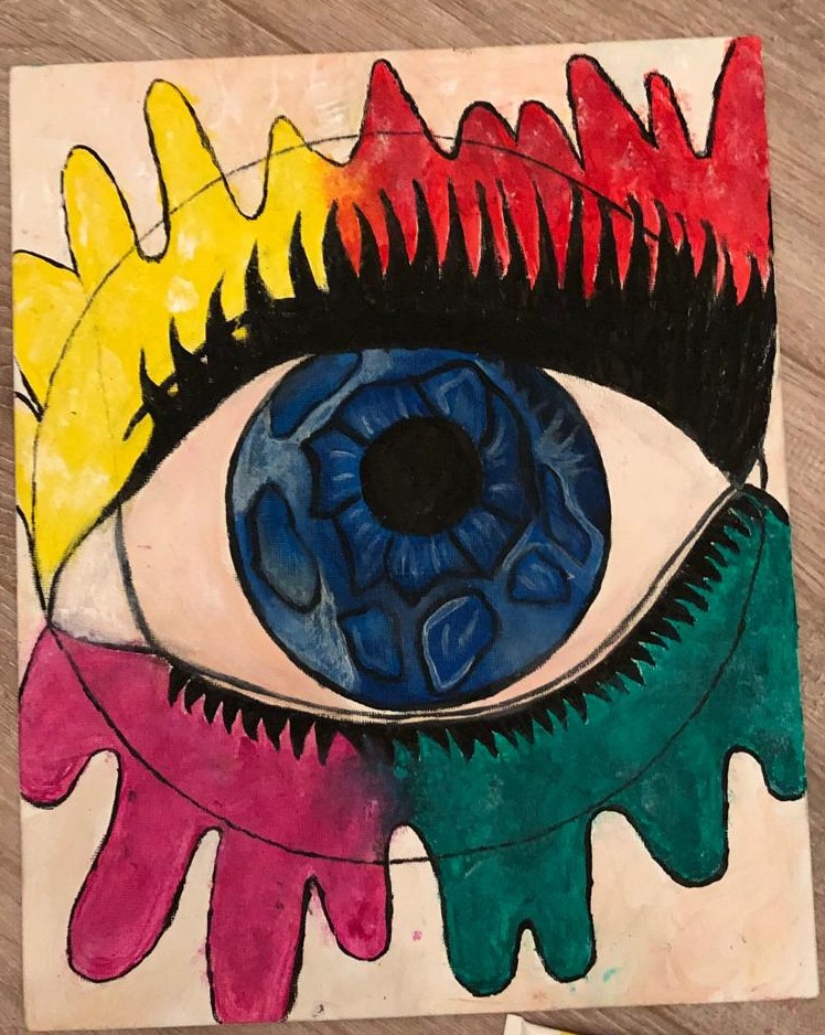 Das Auge steht hier als Symbol für Wahrnehmung und Bewusstsein: Es sieht nicht nur die äußere Welt, sondern spiegelt auch das Innere wider. Die kräftigen Farben – das leuchtende Rot, das warme Gelb, das beruhigende Grün und das tiefe Blau – zeigen die Vielfalt menschlicher Emotionen.