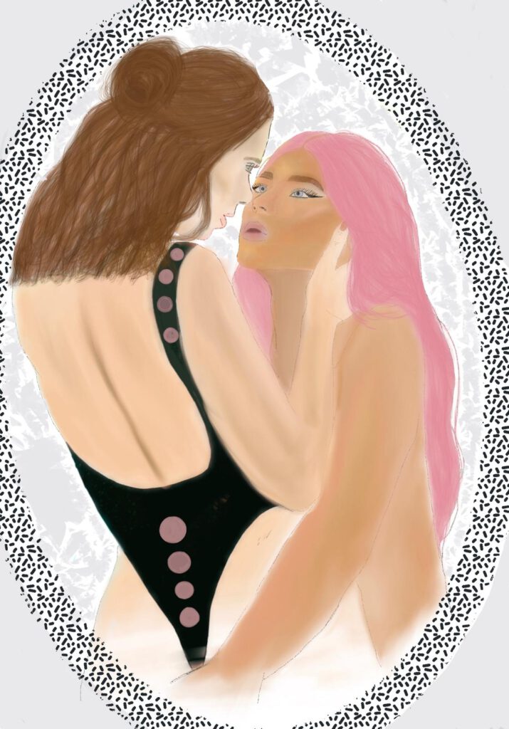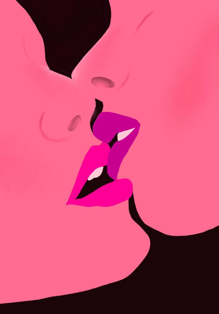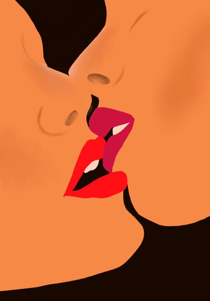 Dieses Werk (30×40 cm) zeigt zwei Lippen im Moment eines Kusses – zart, tastend, beinahe schwebend.